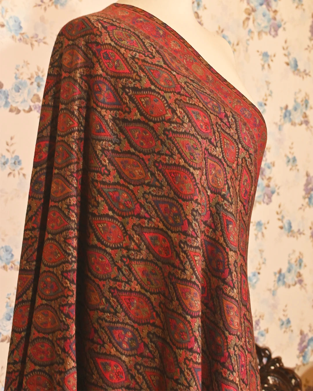 A dark wine-garnet shawl with cool undertones and elegant zari weaving. Its deep hues create a polished winter look, ideal for night events and festive layering.