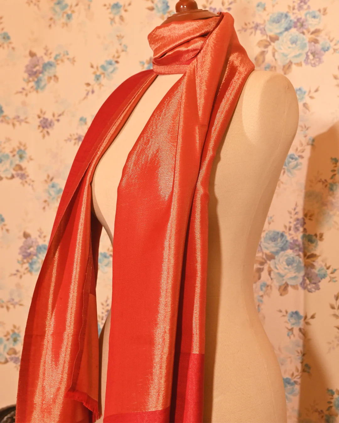 A deep red moonlight-zari stole with a luminous sheen. Lightweight, festive, and perfect for winter styling.